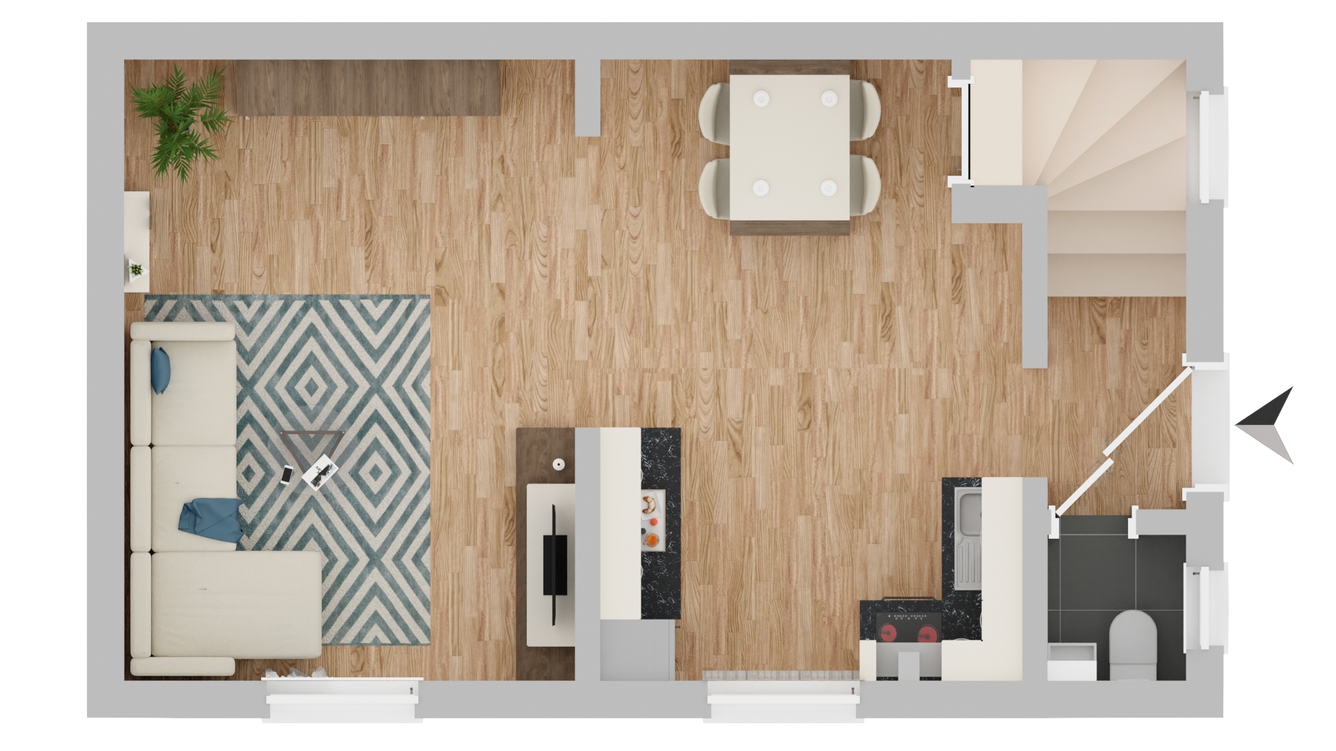 Beim Betreten der Immobilie gelangen Sie in den Eingangsbereich, von dem aus Sie zur linken Seite ein WC erreichen. Geradeaus führt Sie die Diele in die offene Wohnküche, die direkt mit dem gemütlichen Wohnzimmer verbunden ist.