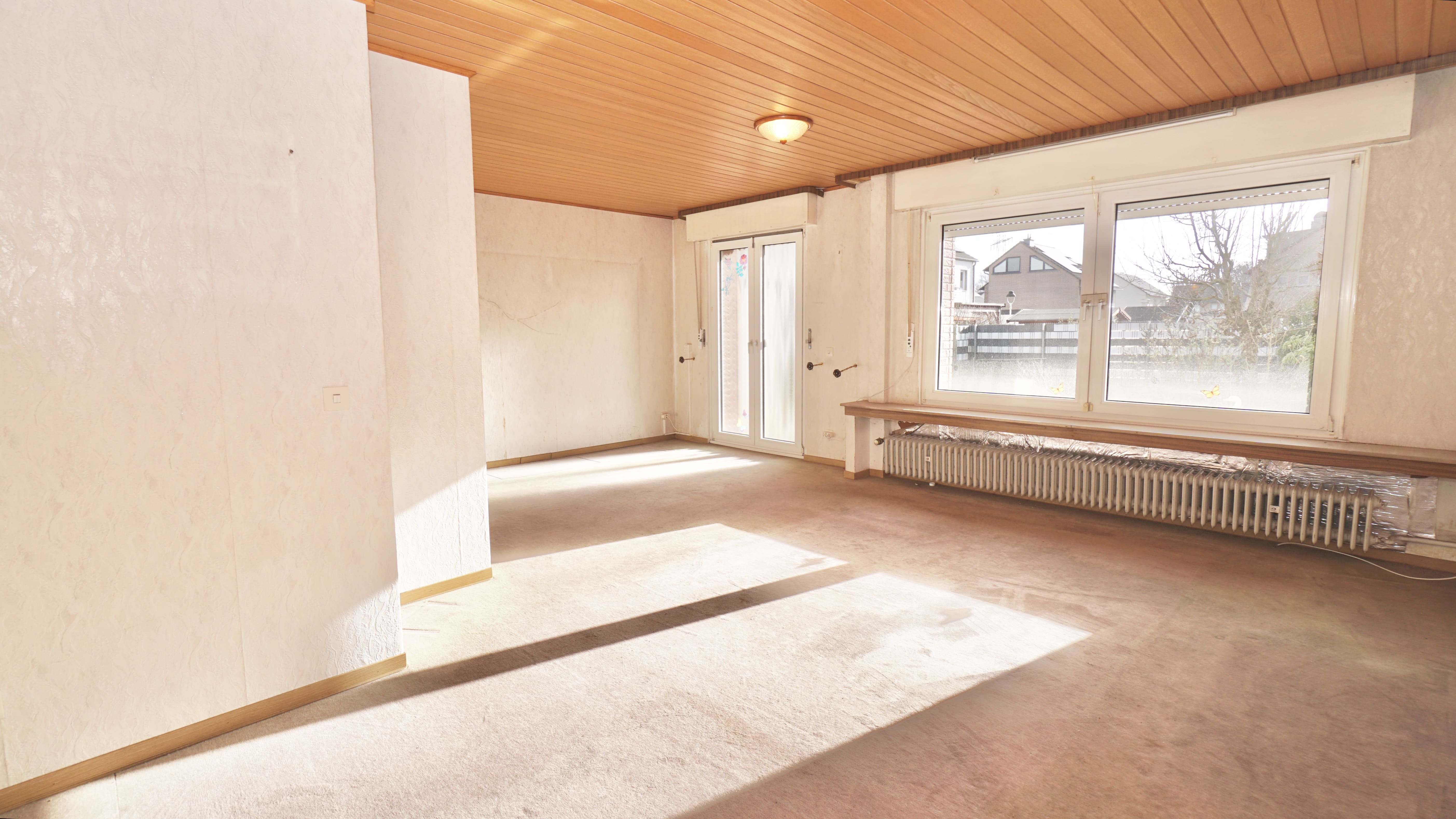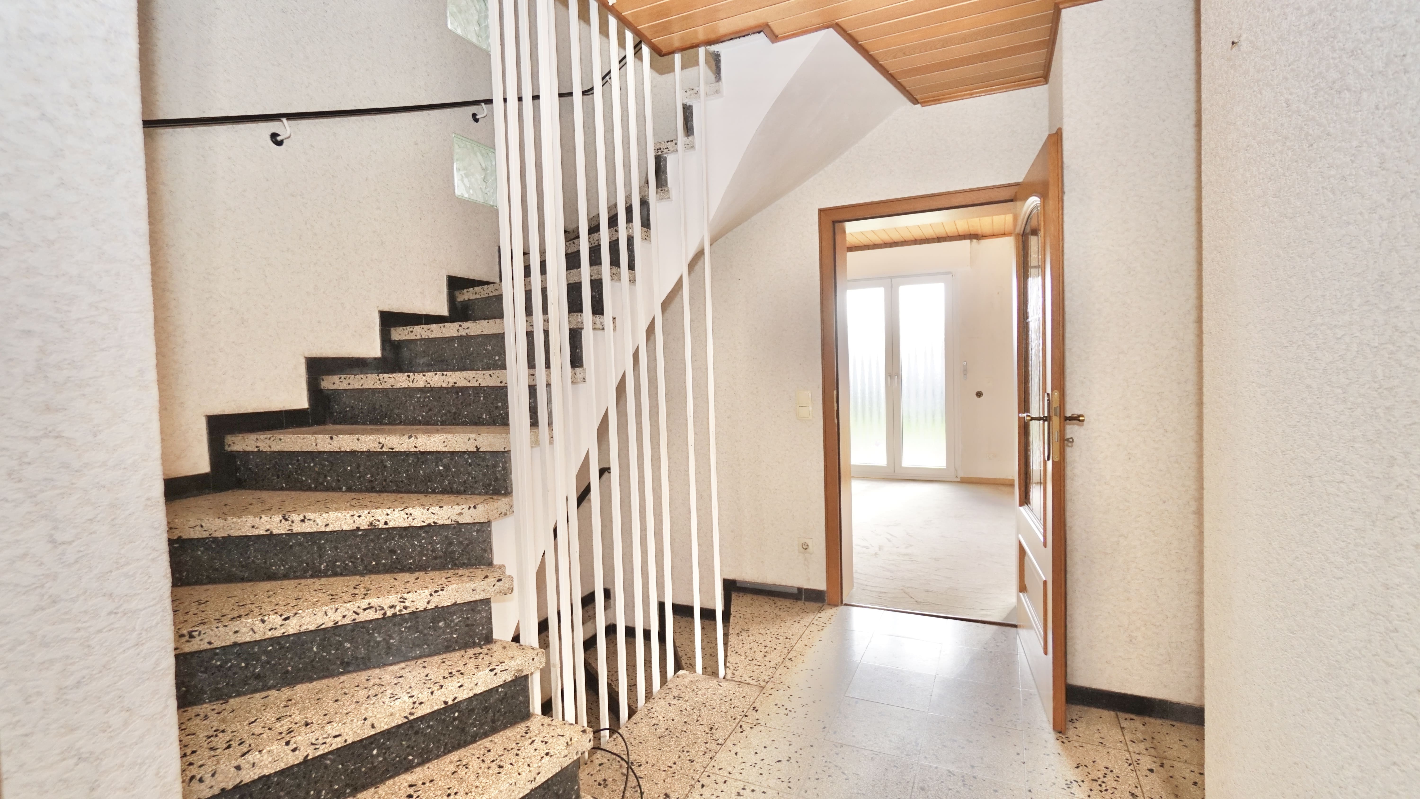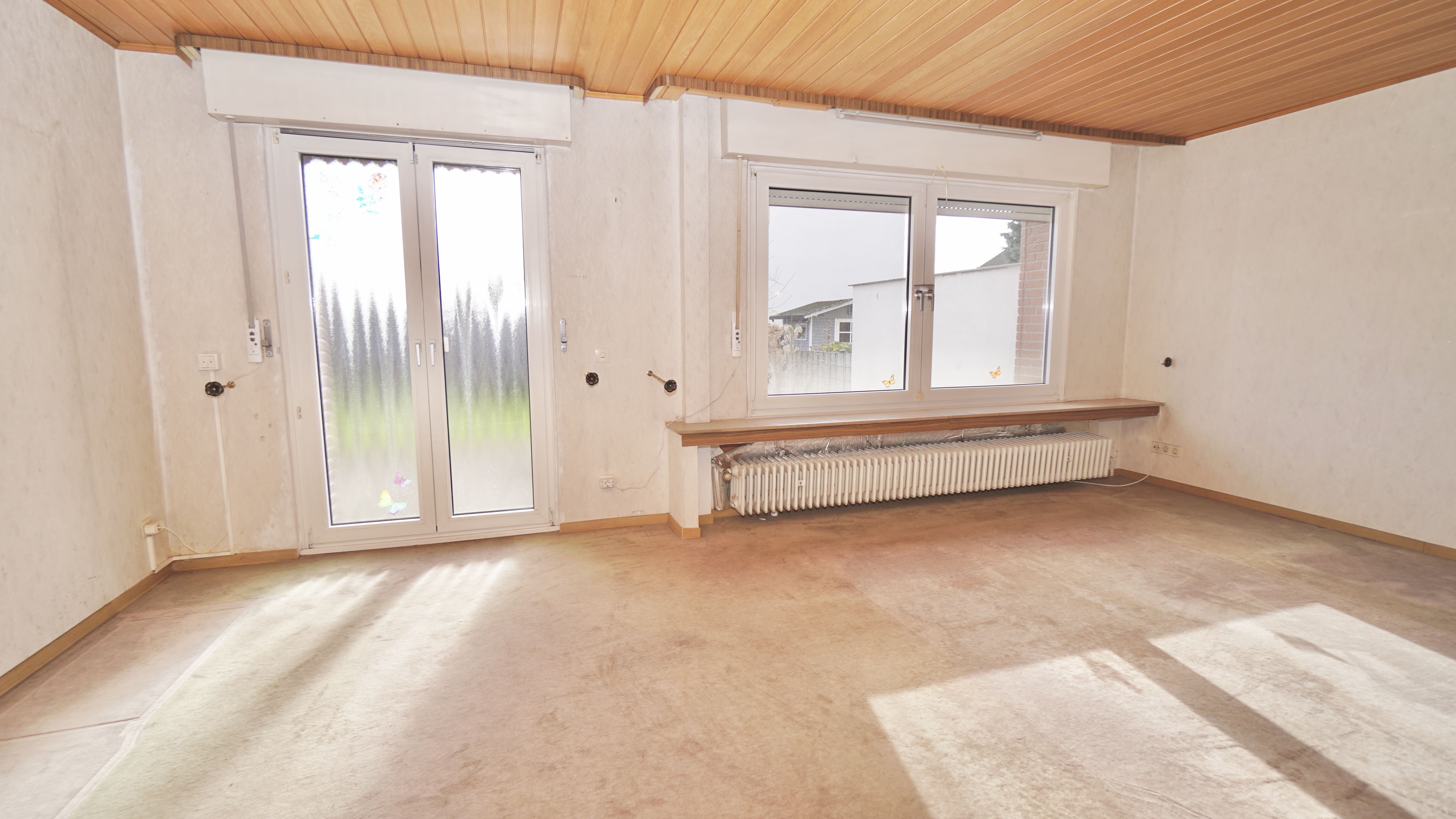 Sie betreten das Haus über die zentrale Eingangsdiele, die zur Treppe ins Ober- und Kellergeschoss sowie zu den Räumen im Erdgeschoss führt. Links befindet sich ein praktisches Gäste-WC, rechts die knapp 9 m² große Küche, die in einigen Häusern der Nachbarschaft bereits durch einen Durchbruch mit dem Wohnzimmer verbunden wurde. Geradeaus gelangen Sie in das großzügige, ca. 30 m² große Wohnzimmer, das dank der großen Fensterfront lichtdurchflutet ist und einen schönen Blick auf den gepflegten Garten bietet. Durch die Terrassentür haben Sie direkten Zugang zur 20 m² großen Terrasse sowie zum grünen, nach Süden ausgerichteten Garten – ideal für entspannte Stunden im Freien. Zudem gibt es von hier einen Zugang zum Keller und zur Doppelgarage.