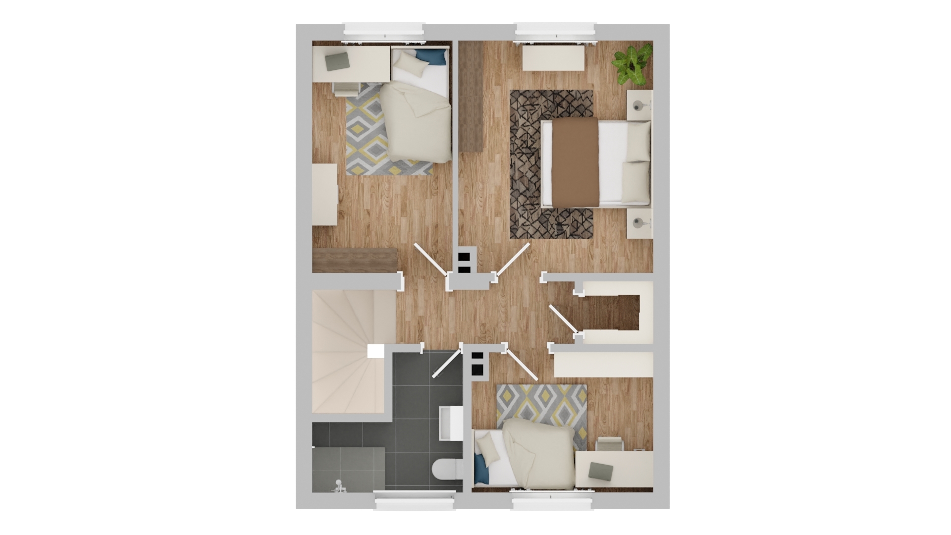 Im Obergeschoss befindet sich das Tageslicht-Badezimmer. Darüber hinaus stehen Ihnen drei weitere Zimmer zur Verfügung, die flexibel als Schlafzimmer, Kinderzimmer oder Büro genutzt werden können. Am Ende des Flurs bietet ein praktischer Abstellraum zusätzlichen Stauraum.