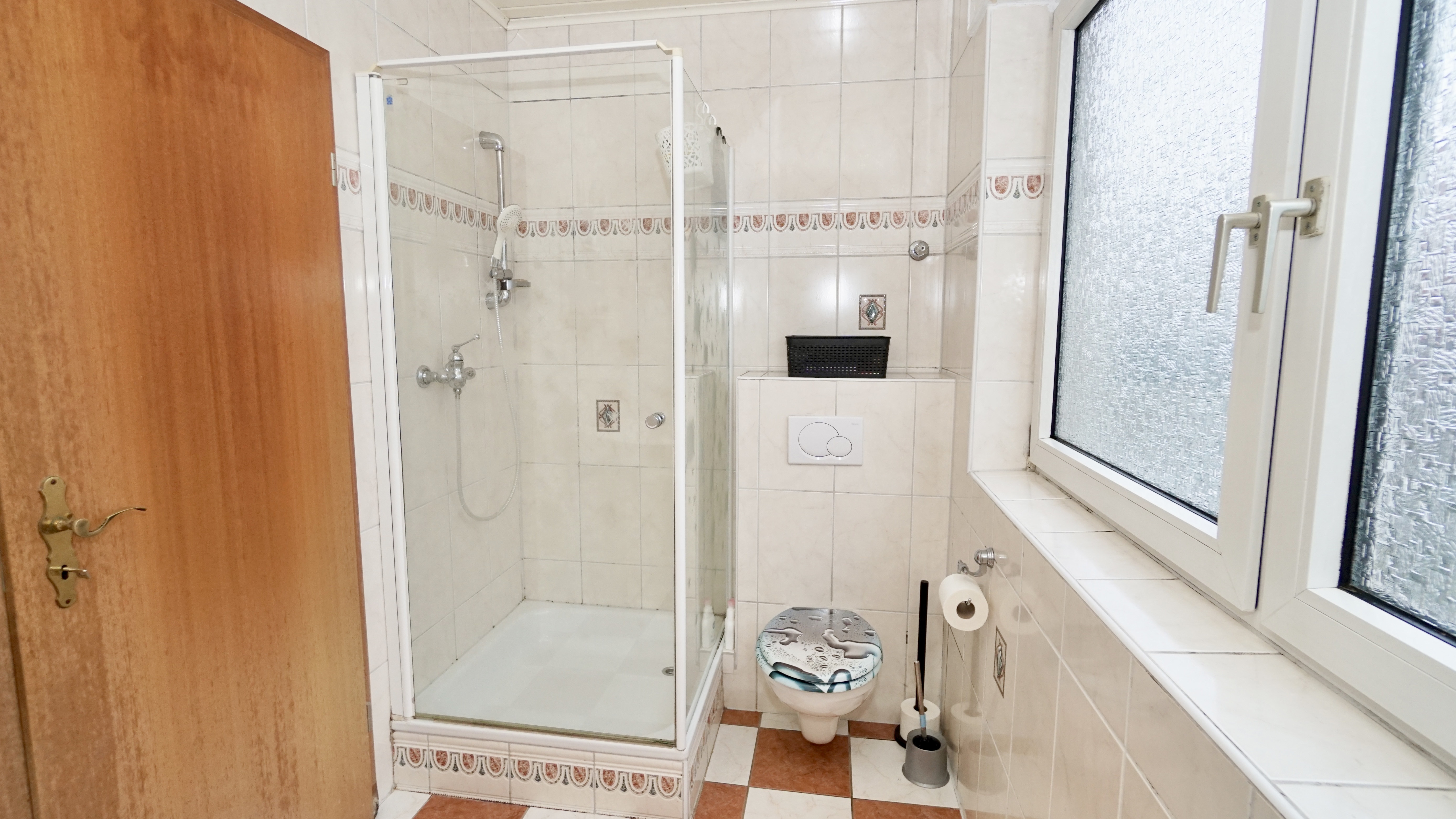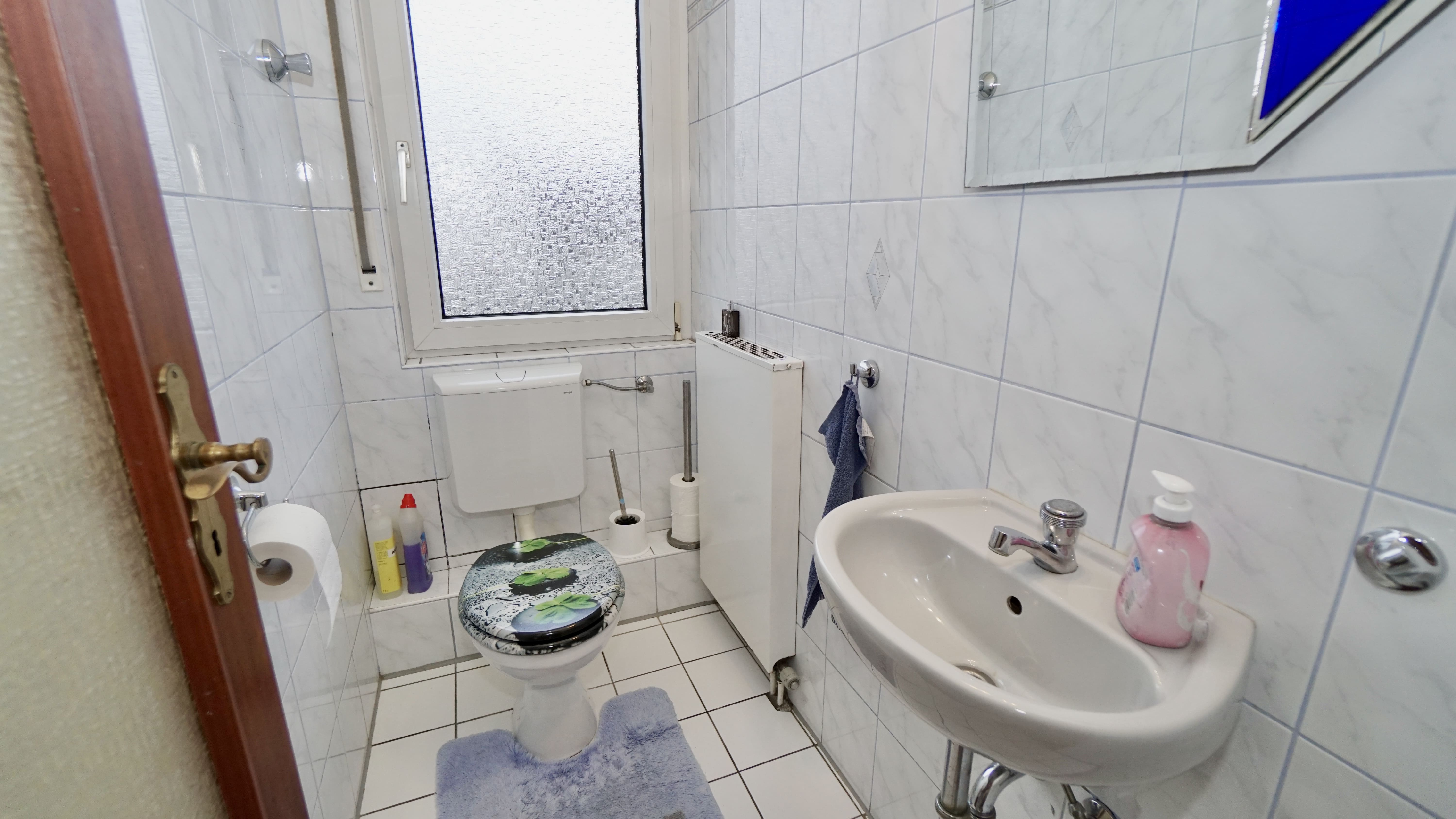 Das Badezimmer wurde im Jahr 2004 modernisiert und mit Badewanne, Dusche, Hänge-WC, einem unter Putz liegenden Spülkasten sowie einer Fußbodenheizung ausgestattet. Auch das Gäste-WC erhielt im selben Jahr ein Hänge-WC mit Unterputz-Spülkasten.