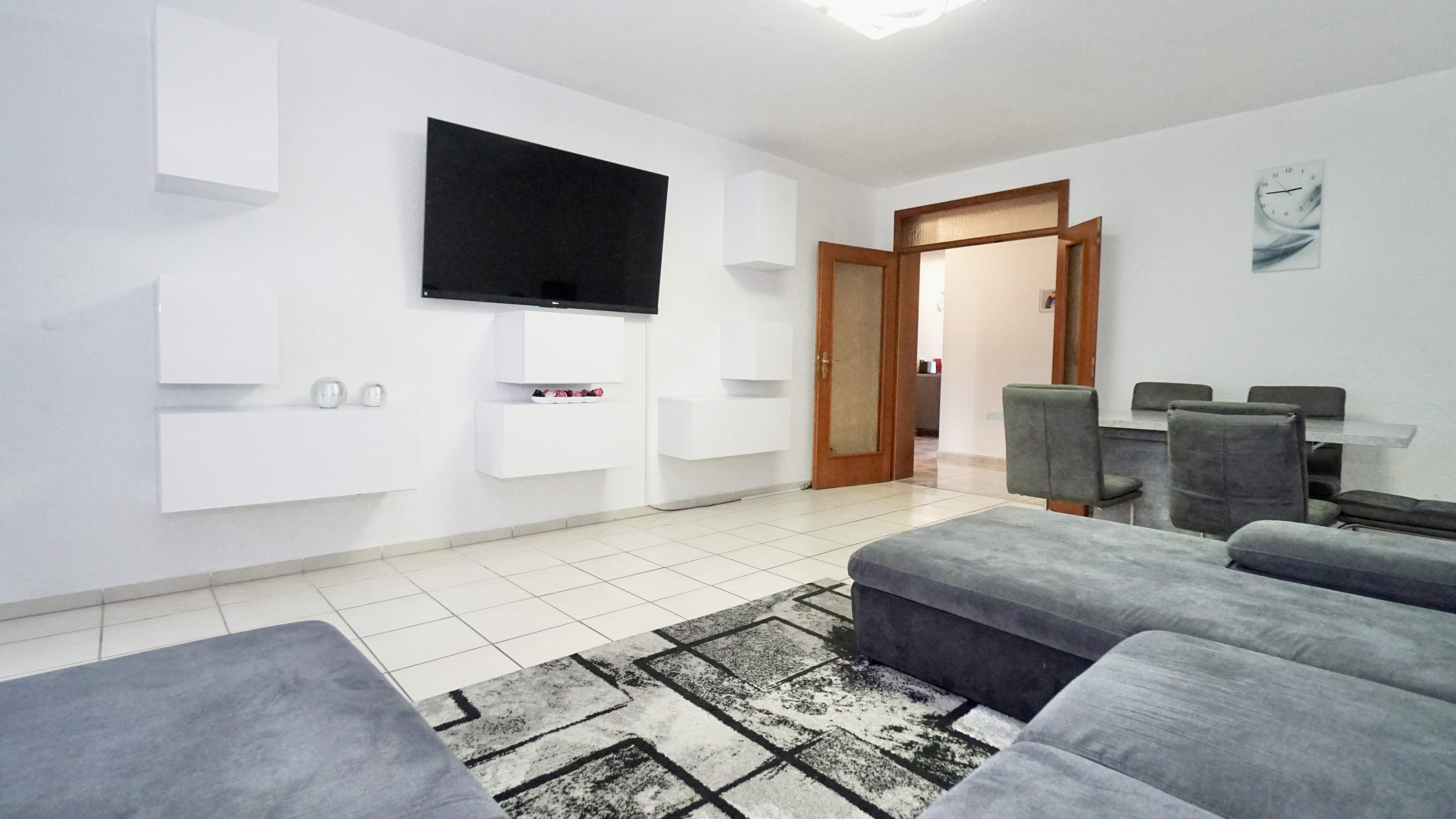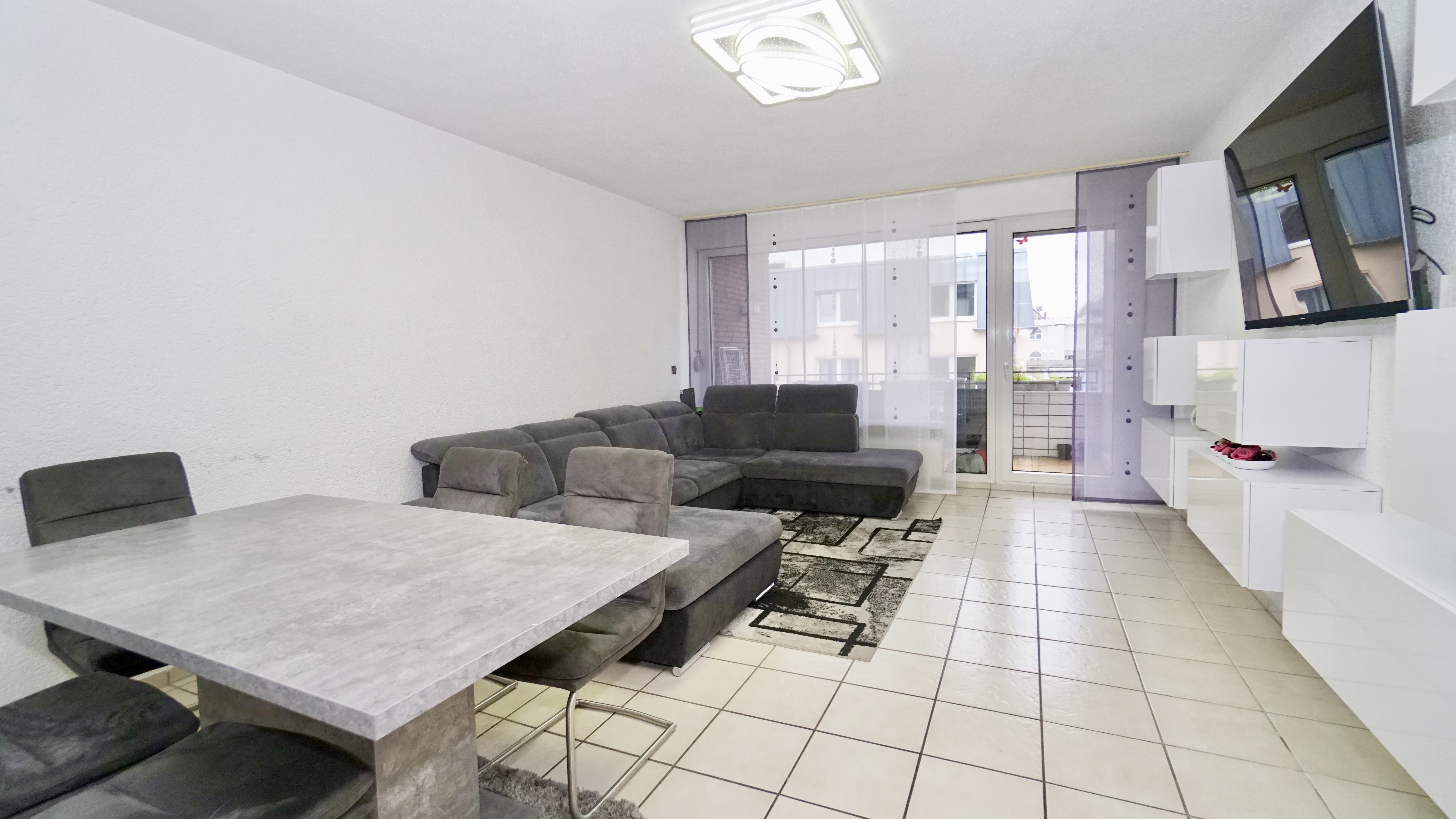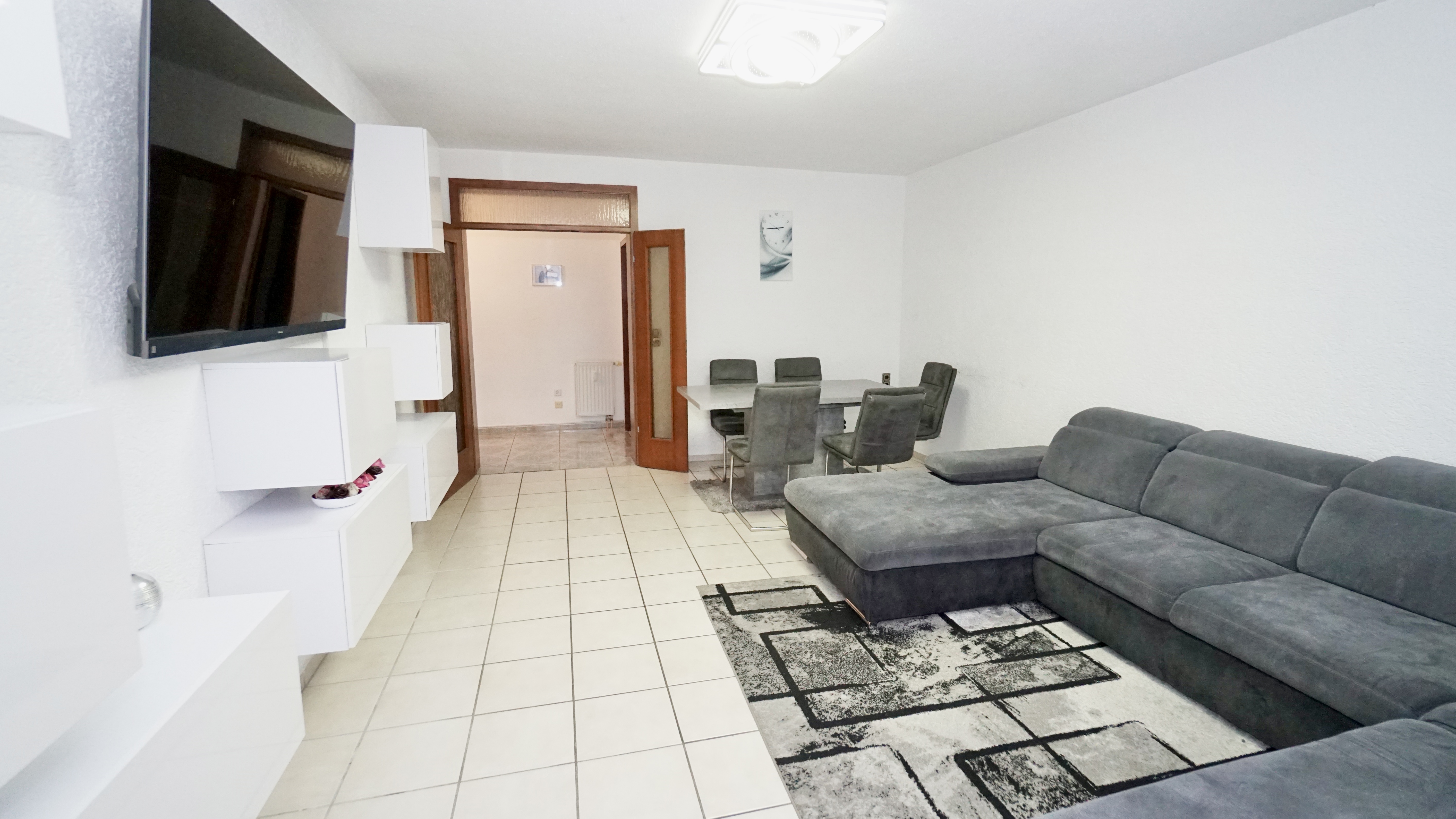 Das geräumige Wohnzimmer auf der rechten Seite der Diele bildet das Herzstück der Wohnung. Durch die großen Fensterflächen wirkt der Raum besonders hell und freundlich. Hier finden sowohl ein gemütlicher Wohnbereich als auch ein Esstisch bequem Platz. Vom Wohnzimmer aus gelangen Sie auf den sonnigen, südlich ausgerichteten Balkon, der mit einem praktischen Einbauschrank zusätzlichen Stauraum bietet.