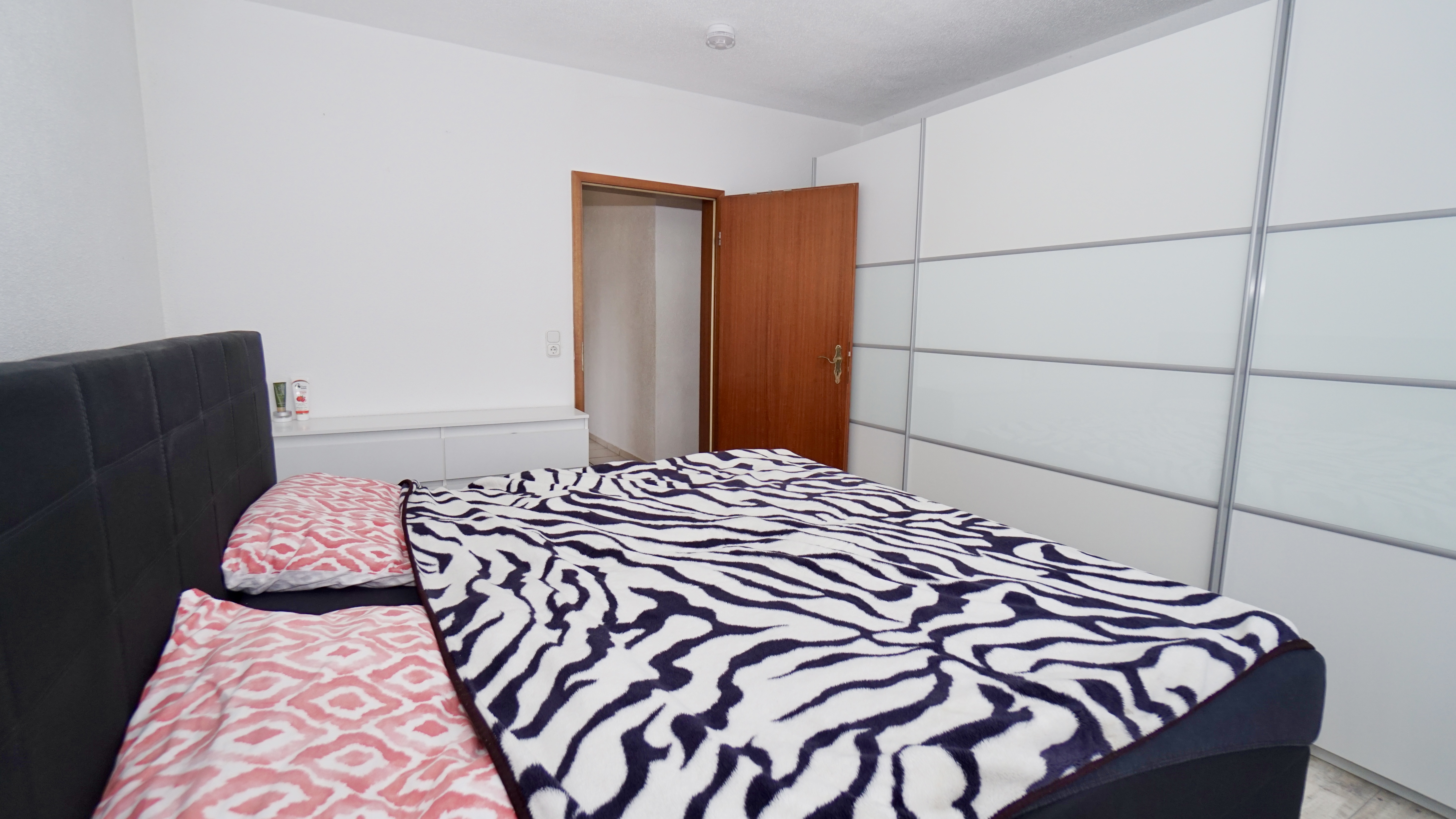 Auf der linken Seite der Diele reihen sich ein weiteres Kinderzimmer sowie das großzügige Schlafzimmer mit Platz für ein Doppelbett, zwei Nachttische, einen Kleiderschrank und eine Kommode.