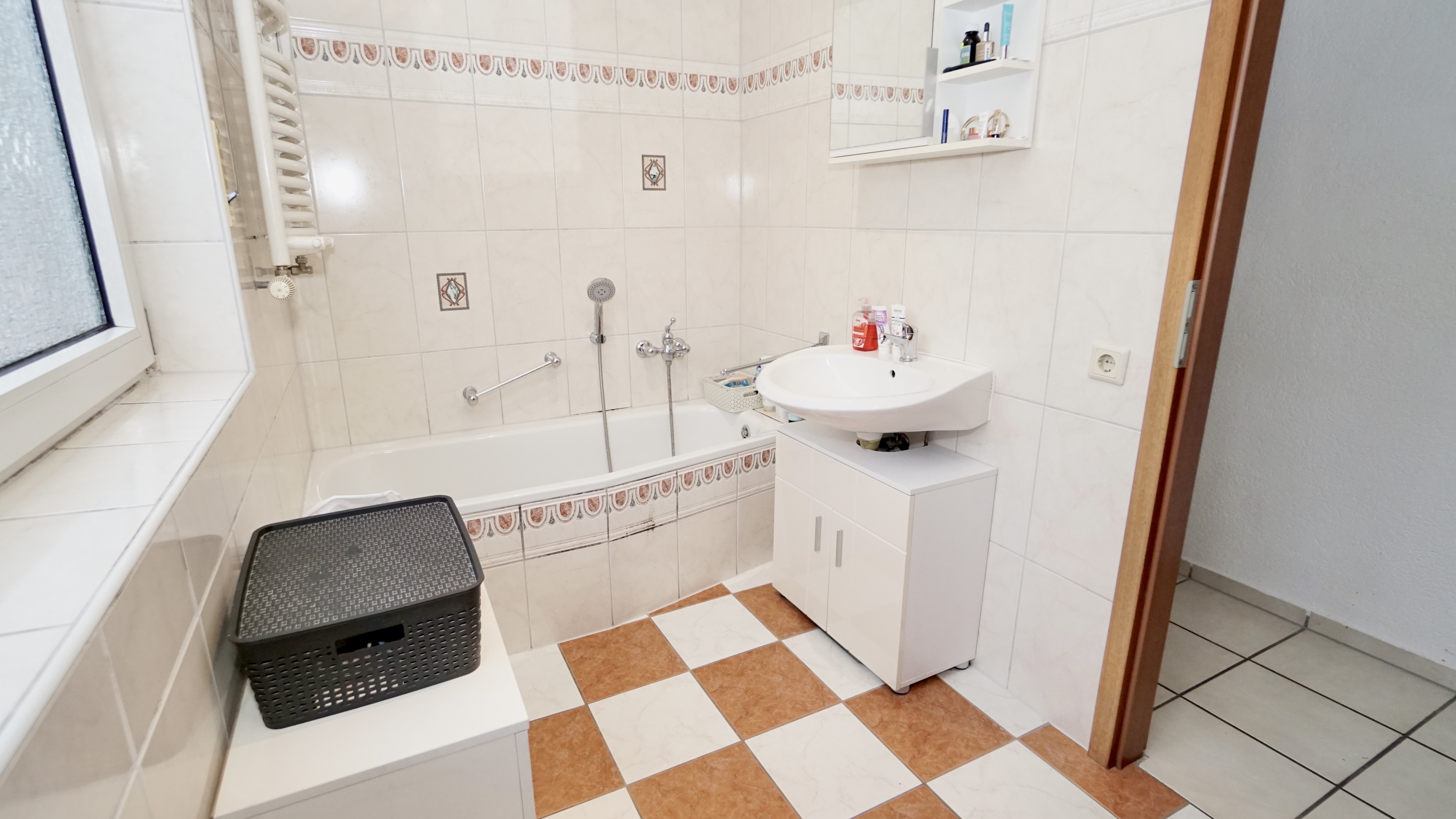 Am Ende der Diele auf der rechten Seite befinden sich das helle Tageslichtbadezimmer, ausgestattet mit Badewanne, Dusche und einer Fußbodenheizung, sowie das angrenzende Kinderzimmer, das sich auch ideal für einen Homeoffice-Platz nutzen lässt. Ein separater Abstellraum sorgt für weiteren praktischen Stauraum.