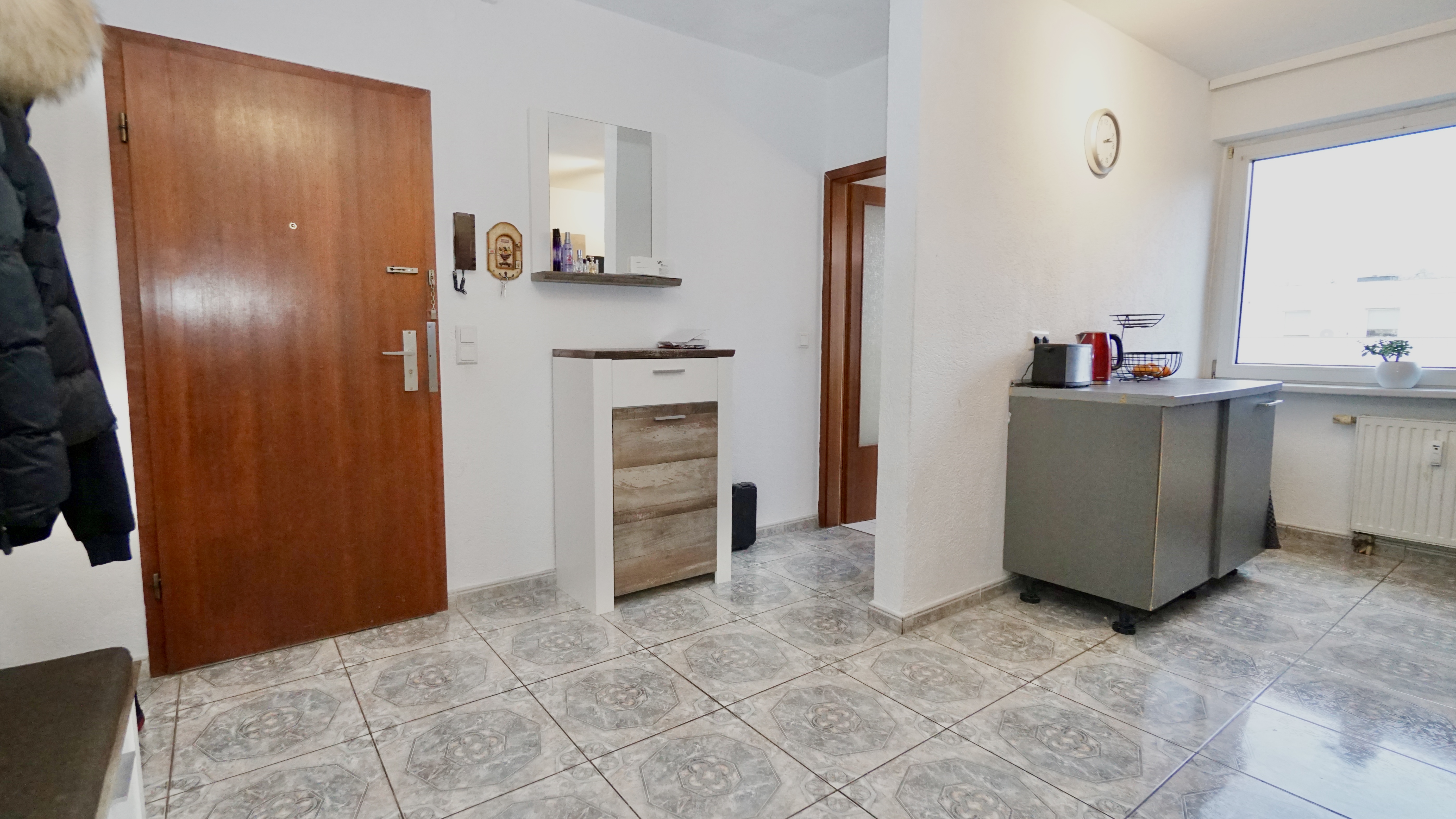 Bereits beim Betreten der Wohnung empfängt Sie eine einladende Diele, die durch ihre Größe ausreichend Platz für eine Kommode sowie eine kleine Garderobe bietet. Zur linken Seite befindet sich die offene Küche mit genügend Raum für eine Küchenzeile sowie einen kleinen Essplatz für zwei Personen. Direkt davor liegt das praktische Gäste-WC.