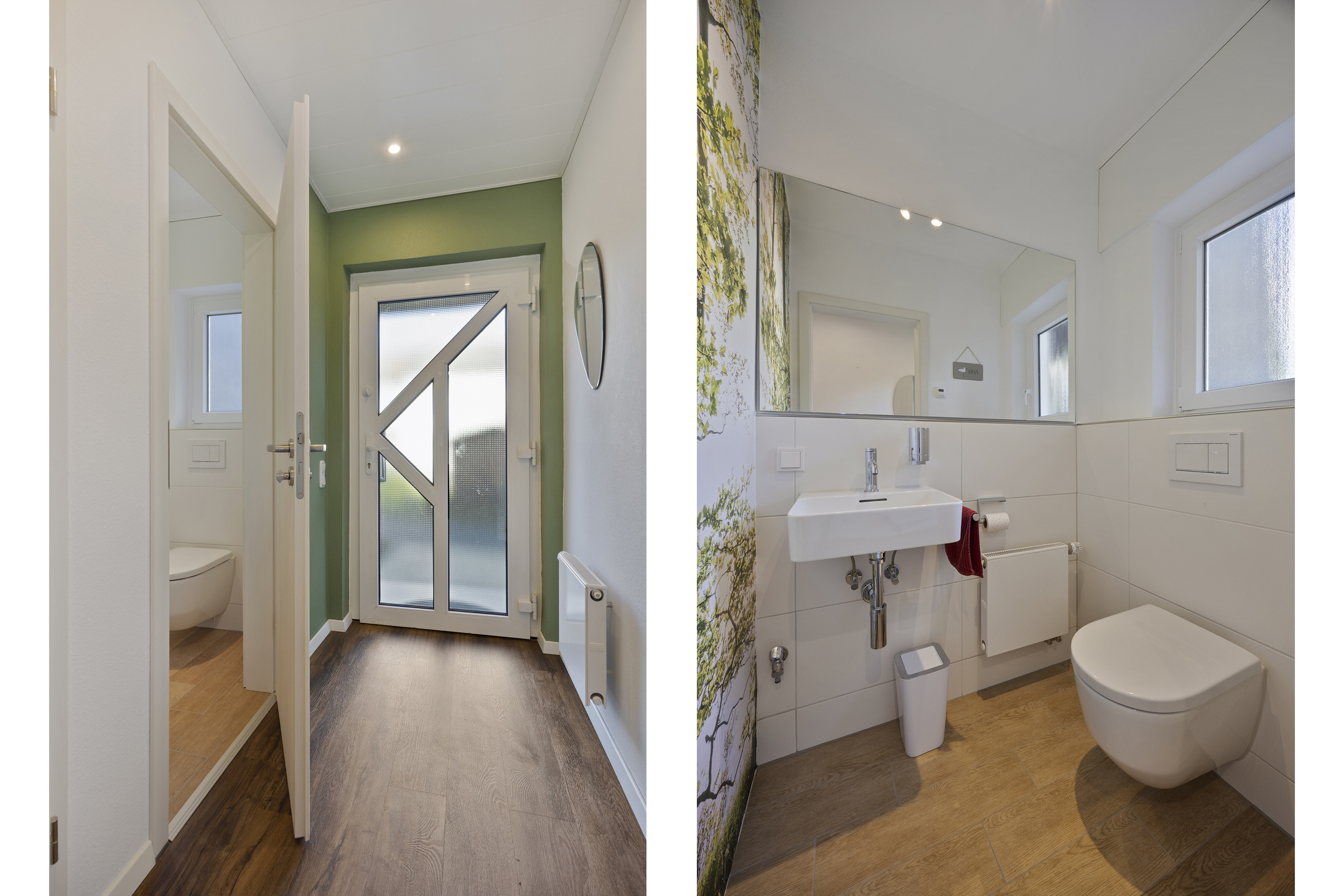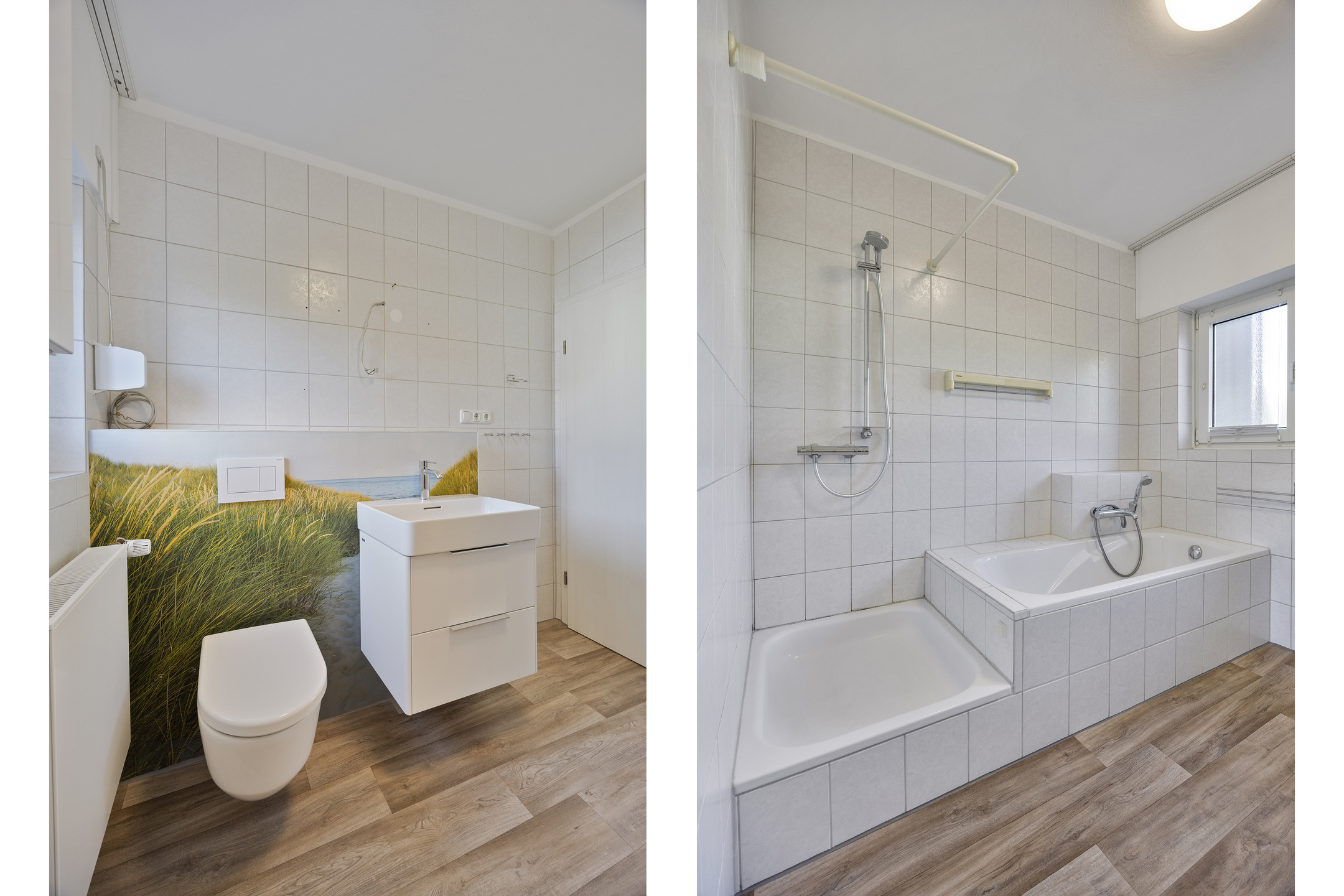 Die Immobilie verfügt über zwei Badezimmer sowie ein separates Gäste-WC. Das erste Badezimmer wurde im Jahr 1999 erneuert und ist mit Badewanne, Dusche und zwei Fenstern ausgestattet. Das zweite Badezimmer im DG wurde im Jahr 2016 sehr modern mit einer Dusche und maßgefertigten Spiegel und Glaskabine ausgestattet, während das Gäste-WC im Jahr 2023 inklusive neuer Zu- und Abwasserleitungen bis in den Keller modernisiert wurde.