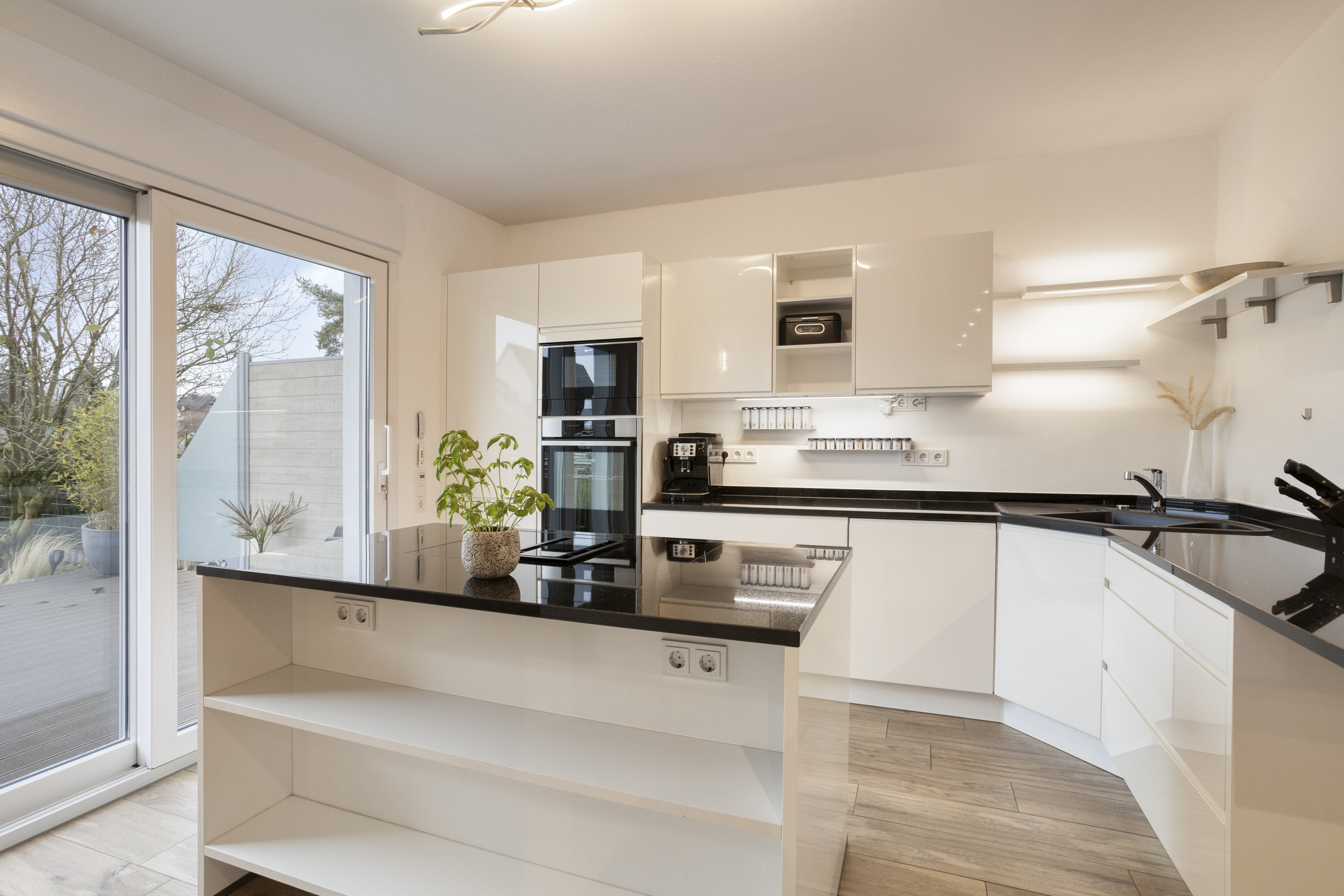 Von der Küche aus gelangen Sie durch eine platzsparende Schiebetür auf die moderne Terrasse und weiter in den südlich ausgerichteten Garten, der im hinteren Bereich mit einer stilvollen Pergola ausgestattet ist. Hier bietet sich die Möglichkeit, den grünen Außenbereich vielseitig zu nutzen – vom lebendigen Spielbereich bis hin zu einem ruhigen Rückzugsort im sonnigen hinteren Gartenteil zum Entspannen.