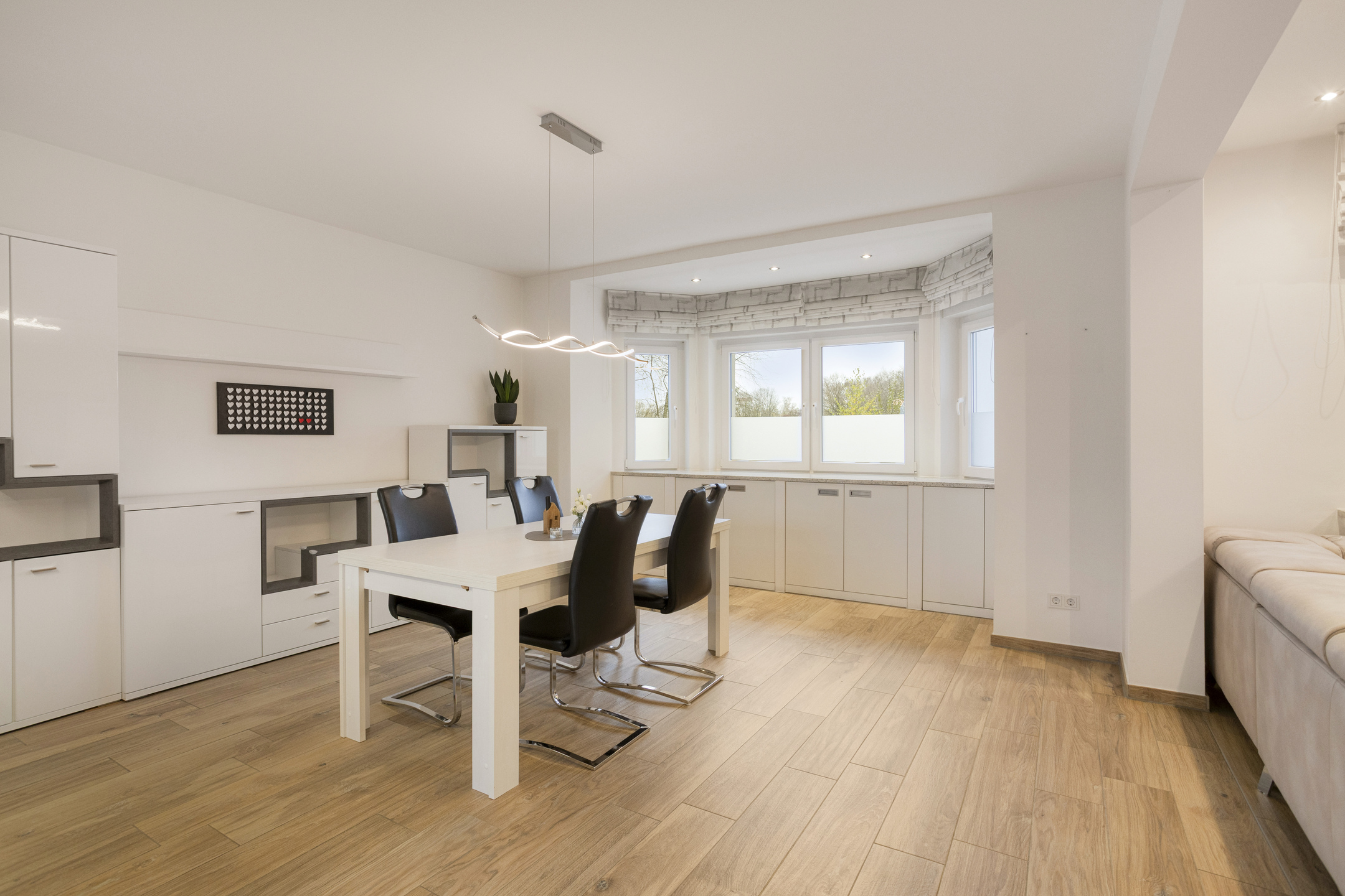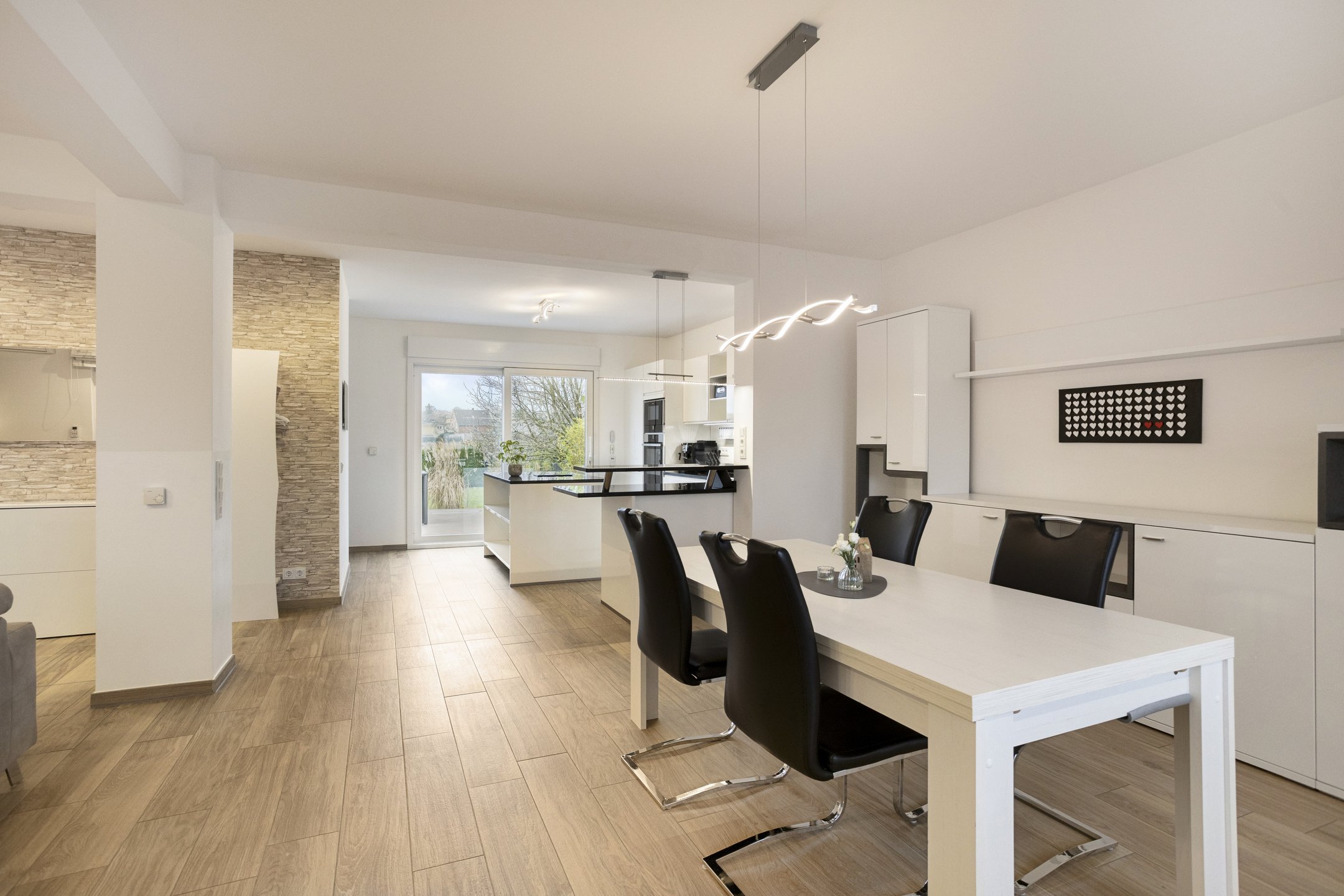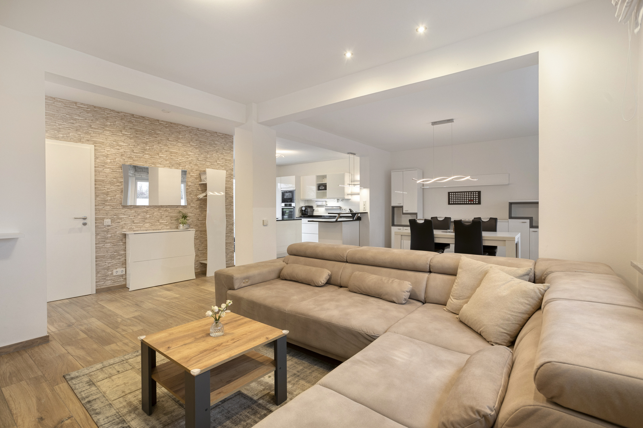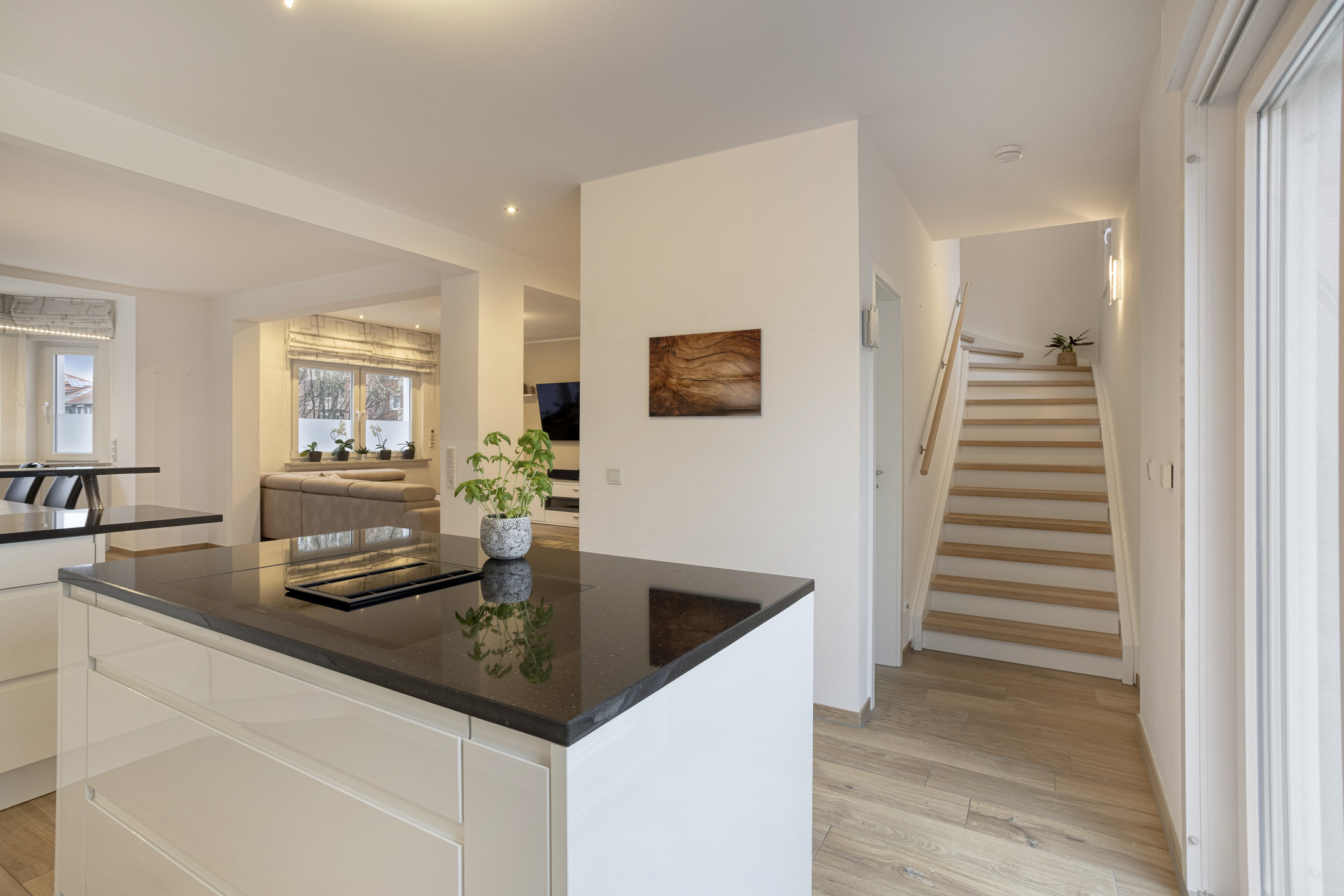 Schon beim Betreten des Hauses empfängt Sie eine einladende Diele, die Ihnen auf direktem Wege Zugang zum Herzen des Hauses eröffnet: dem offenen Wohn-, Ess- und Kochbereich mit insgesamt rund 60 m². Die offene Raumgestaltung in Kombination mit der Fußbodenheizung und Klimaanlage sorgt zu jeder Jahreszeit für eine besonders einladende Wohnatmosphäre und dazu ein angenehmes Raumklima.