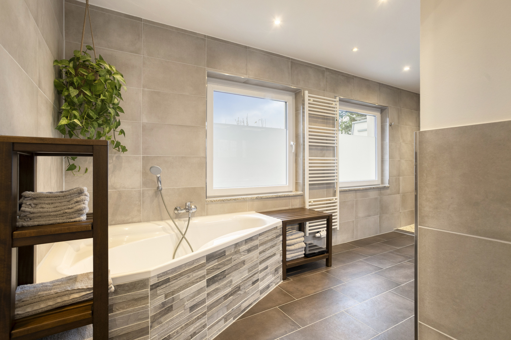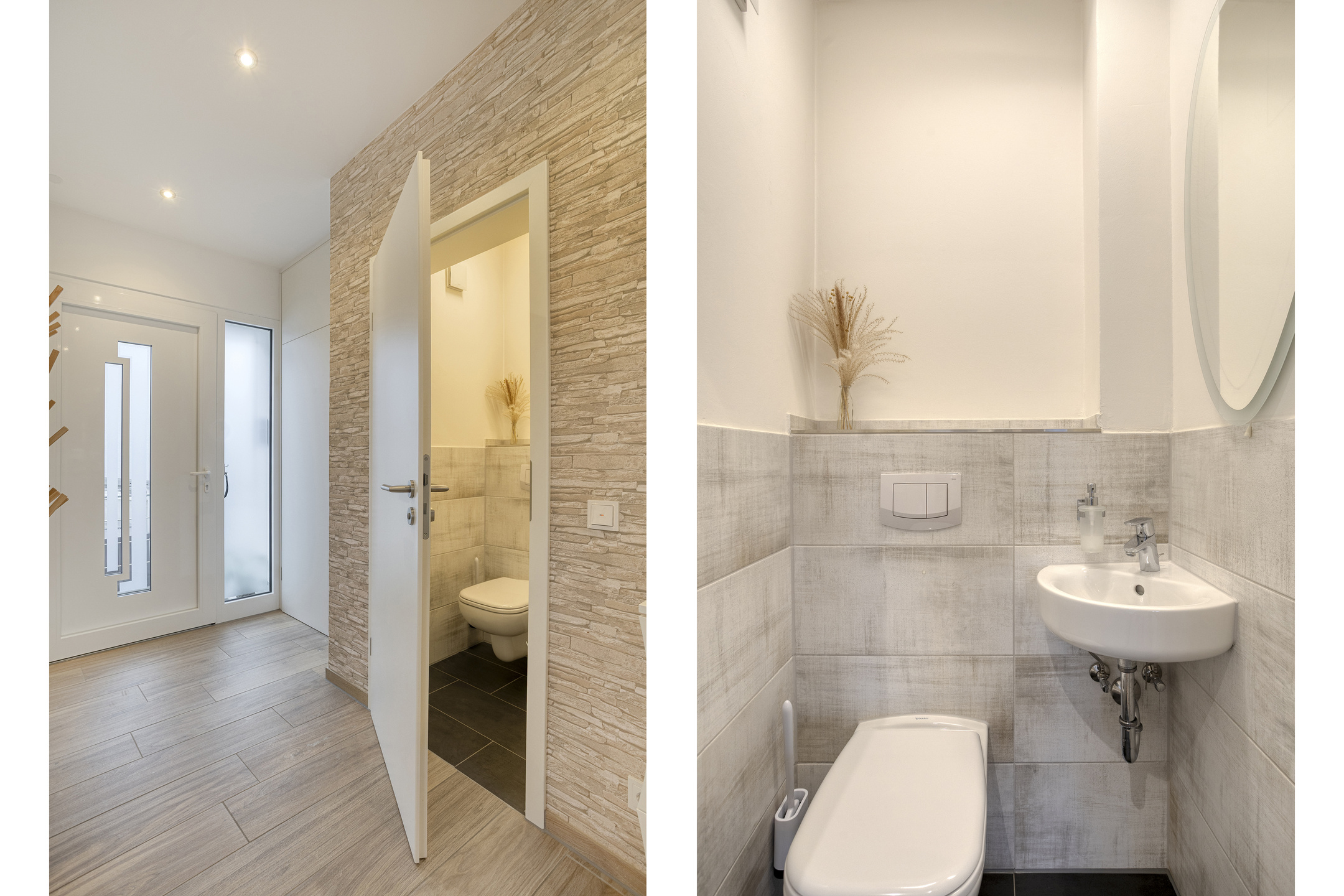 Ergänzt wird das Erdgeschoss durch ein modernisiertes Gäste-WC sowie einen funktionalen Abstellraum neben der Küche. Direkt daneben befindet sich die Treppe, die Sie in den Flur des Obergeschosses führt. Dort erwartet Sie zu Ihrer linken Seite ein großzügiges Tageslichtbad mit rund 13 m², ausgestattet mit einer bodentiefen Dusche, einem modernen Doppelwaschbecken und einem WC.