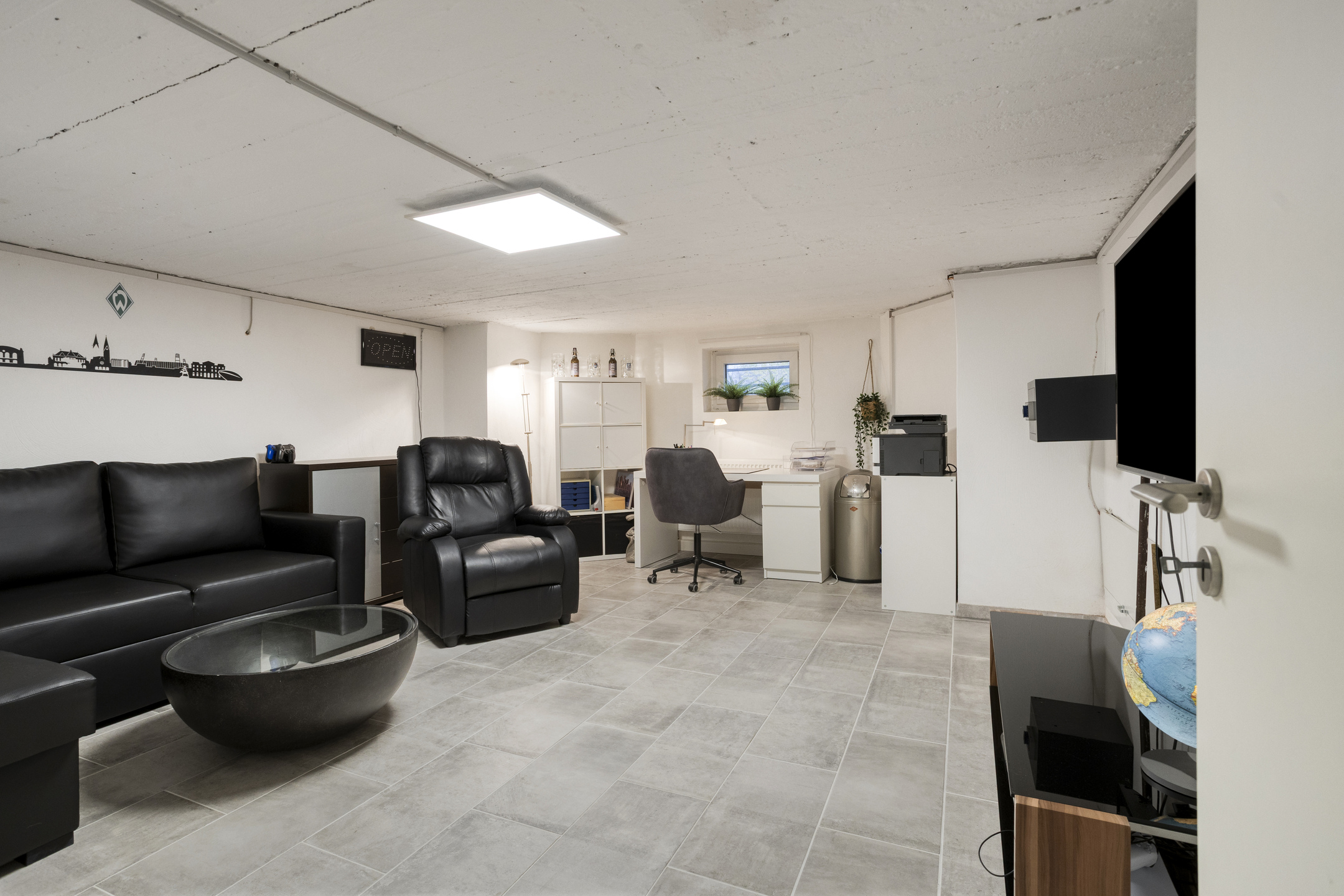 Das vollunterkellerte Untergeschoss bietet neben einer Waschküche, vielseitig nutzbaren Lagerbereichen sowie einem zusätzlichen WC zudem einen wohnlich ausgebauten Hobby- oder Arbeitsraum mit etwa 20 m² Nutzfläche.