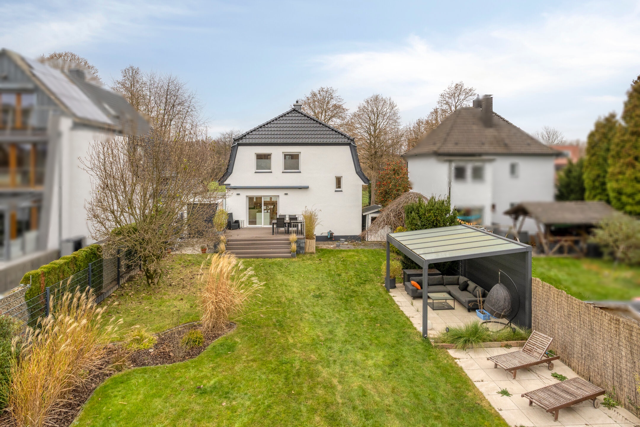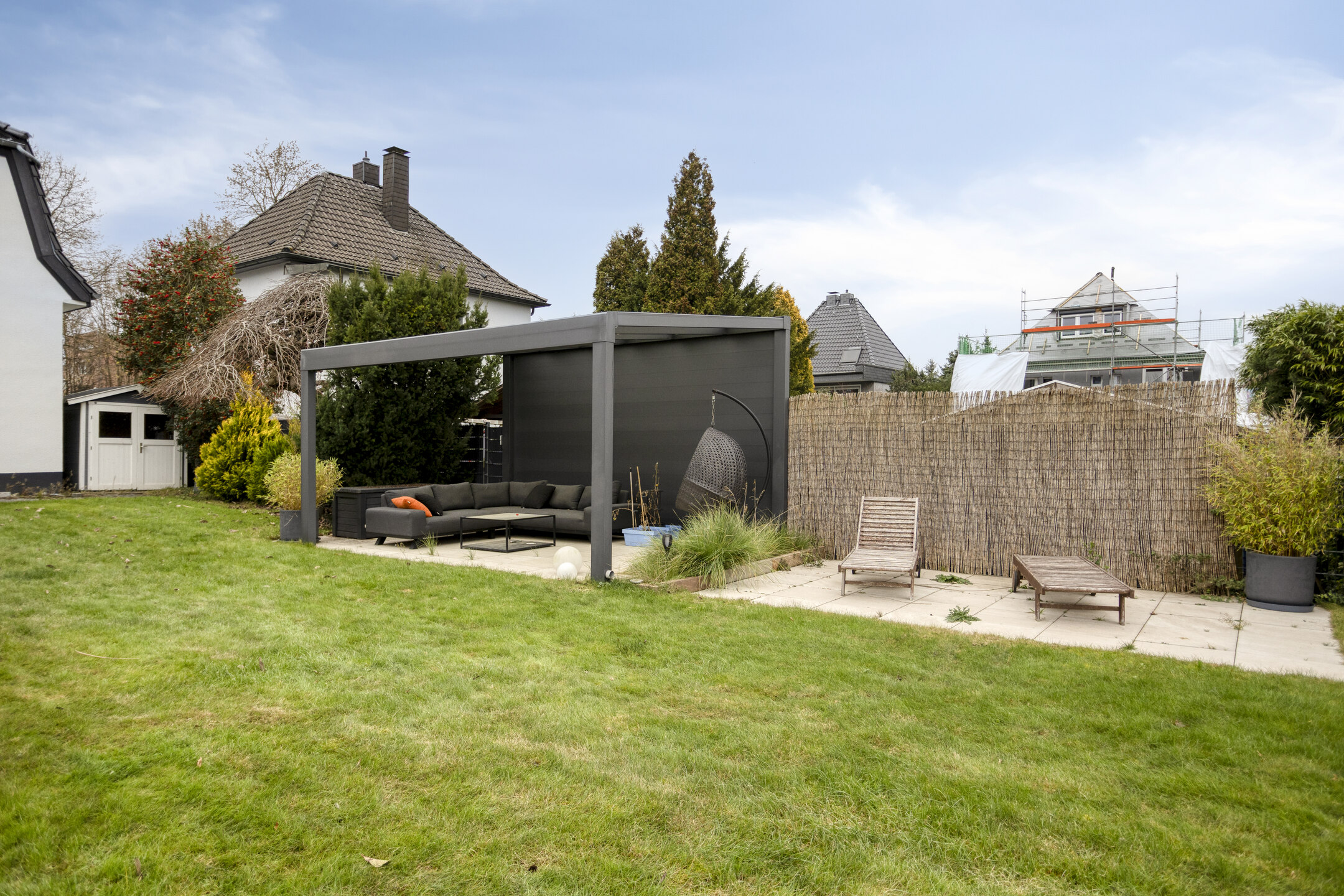 Die großzügige Terrasse wurde im Jahr 2020 neu angelegt und mit einer elektrischen Markise ausgestattet, die eine Fläche von 5 x 5 Metern überspannt. Der Garten bietet neben einer großzügigen Rasenfläche auch eine überdachte Pergola mit dimmbarer Beleuchtung & Außensteckdosen. Eine an der Rückwand der Fassade angebrachte Schlauchtrommel ermöglicht die komfortable Bewässerung des Gartens, während eine zusätzliche in der Garage für die weitere Bewässerung der Einfahrt vorhanden ist.