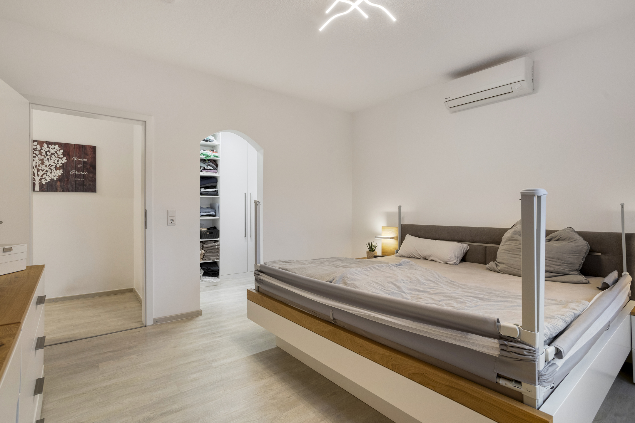 Gegenüber liegt das 15 m² große Kinderzimmer, während am rechten Ende des Flures das 16 m² große Schlafzimmer mit angrenzendem begehbarem Kleiderschrank und einer modernen Klimaanlage zu finden ist.