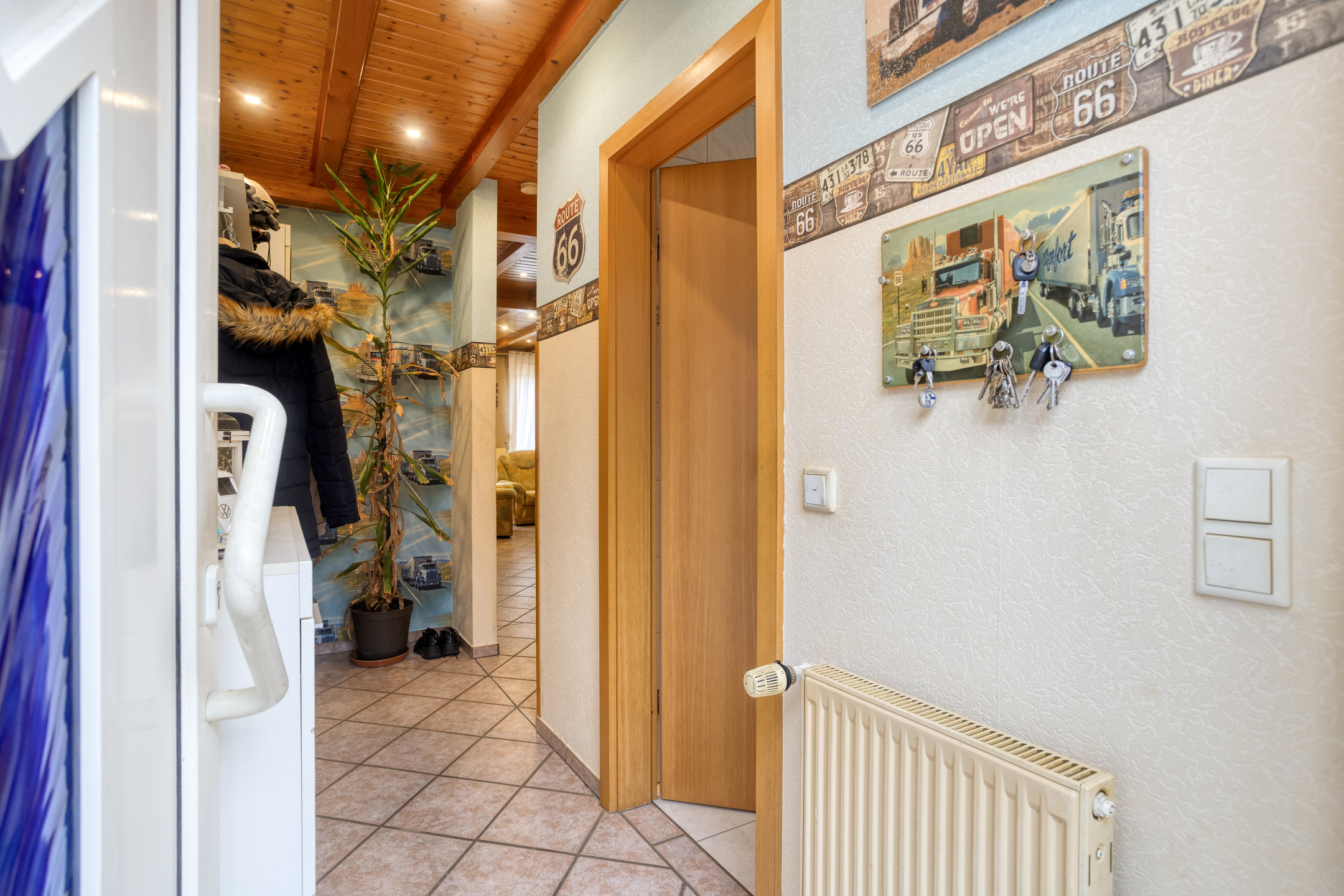Sie betreten die Immobilie über eine einladende Eingangsdiele, die ausreichend Platz für eine Garderobe bietet und Zugang zum praktischen Gäste-WC sowie zum Wohnbereich gewährt.