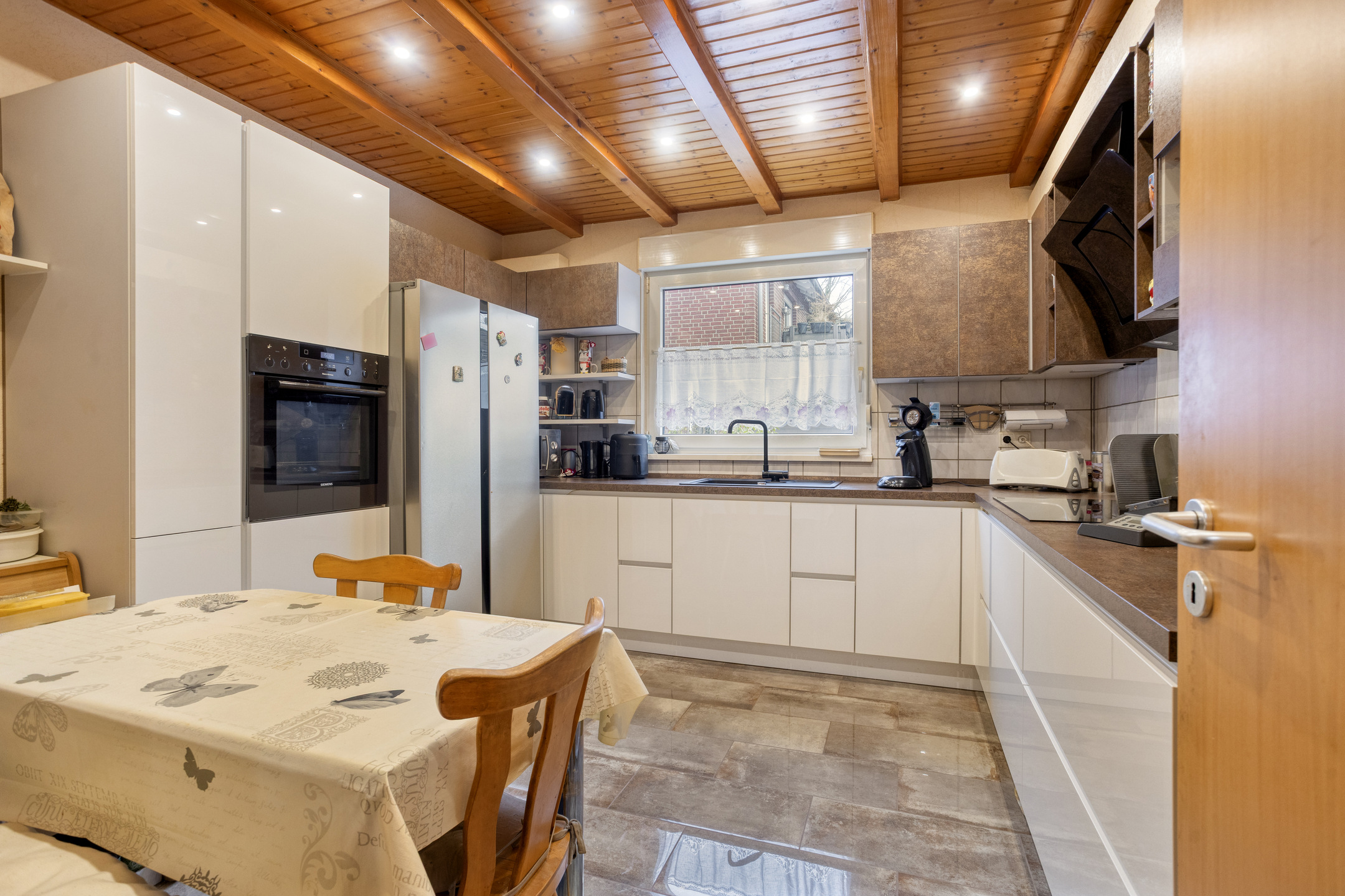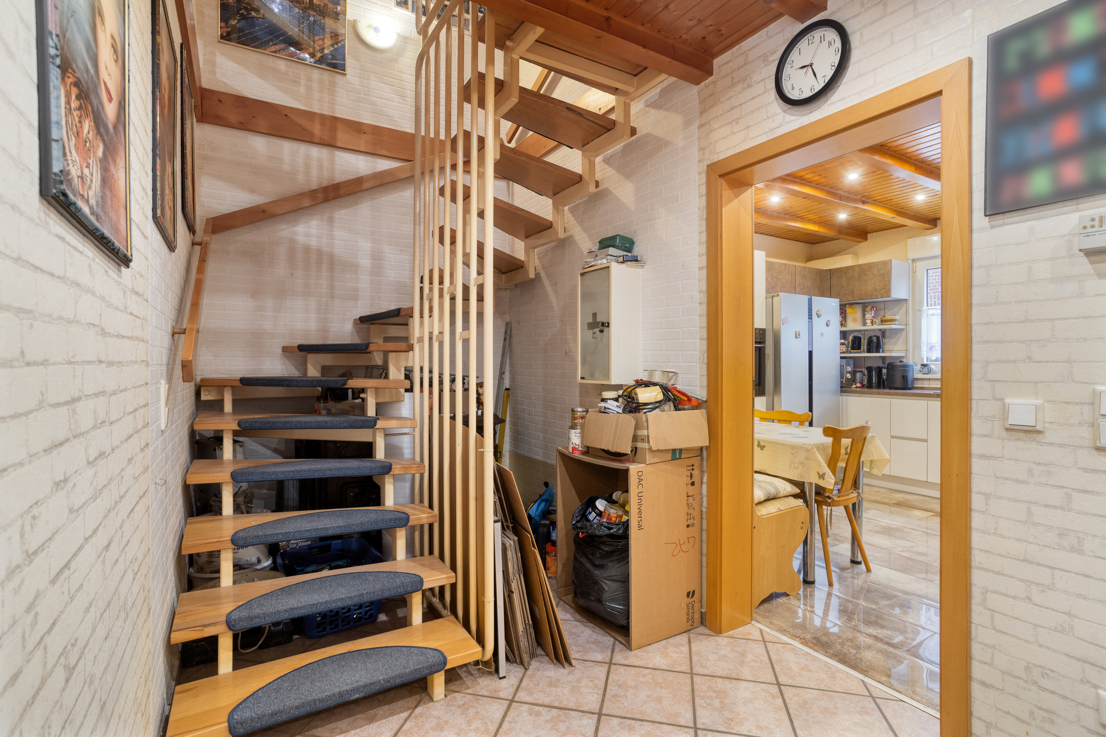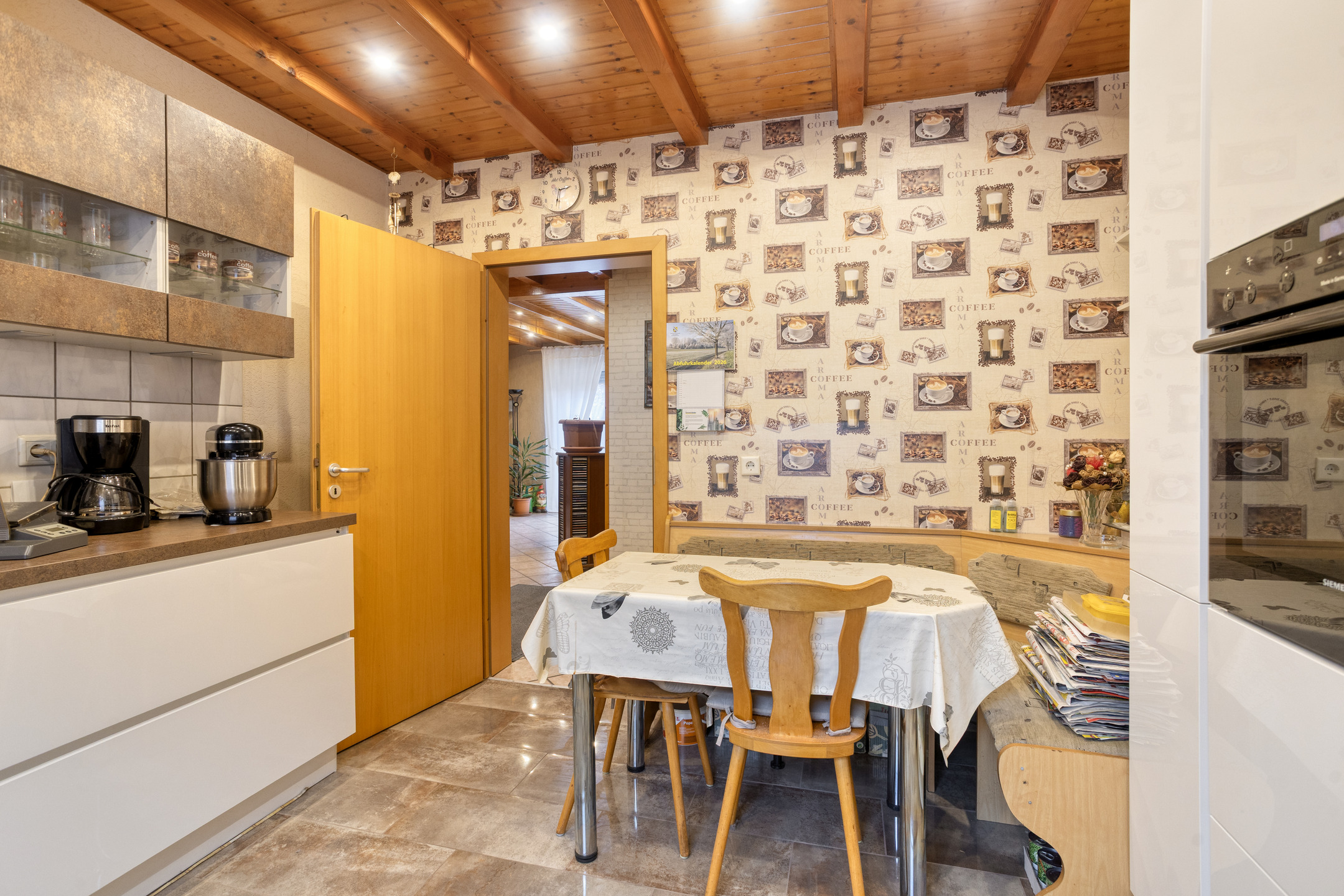 Vom Wohnbereich aus gelangen Sie sowohl in die ca. 13 m² große Küche als auch über die Treppe in das Obergeschoss.