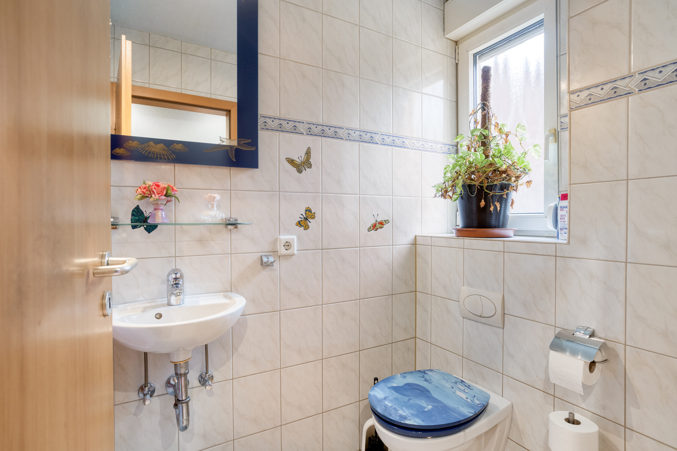 Sie betreten die Immobilie über eine einladende Eingangsdiele, die ausreichend Platz für eine Garderobe bietet und Zugang zum praktischen Gäste-WC sowie zum Wohnbereich gewährt.