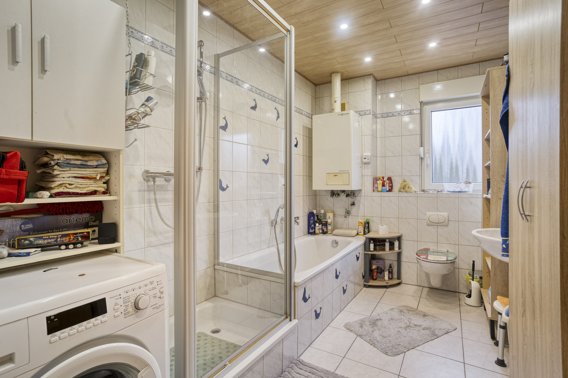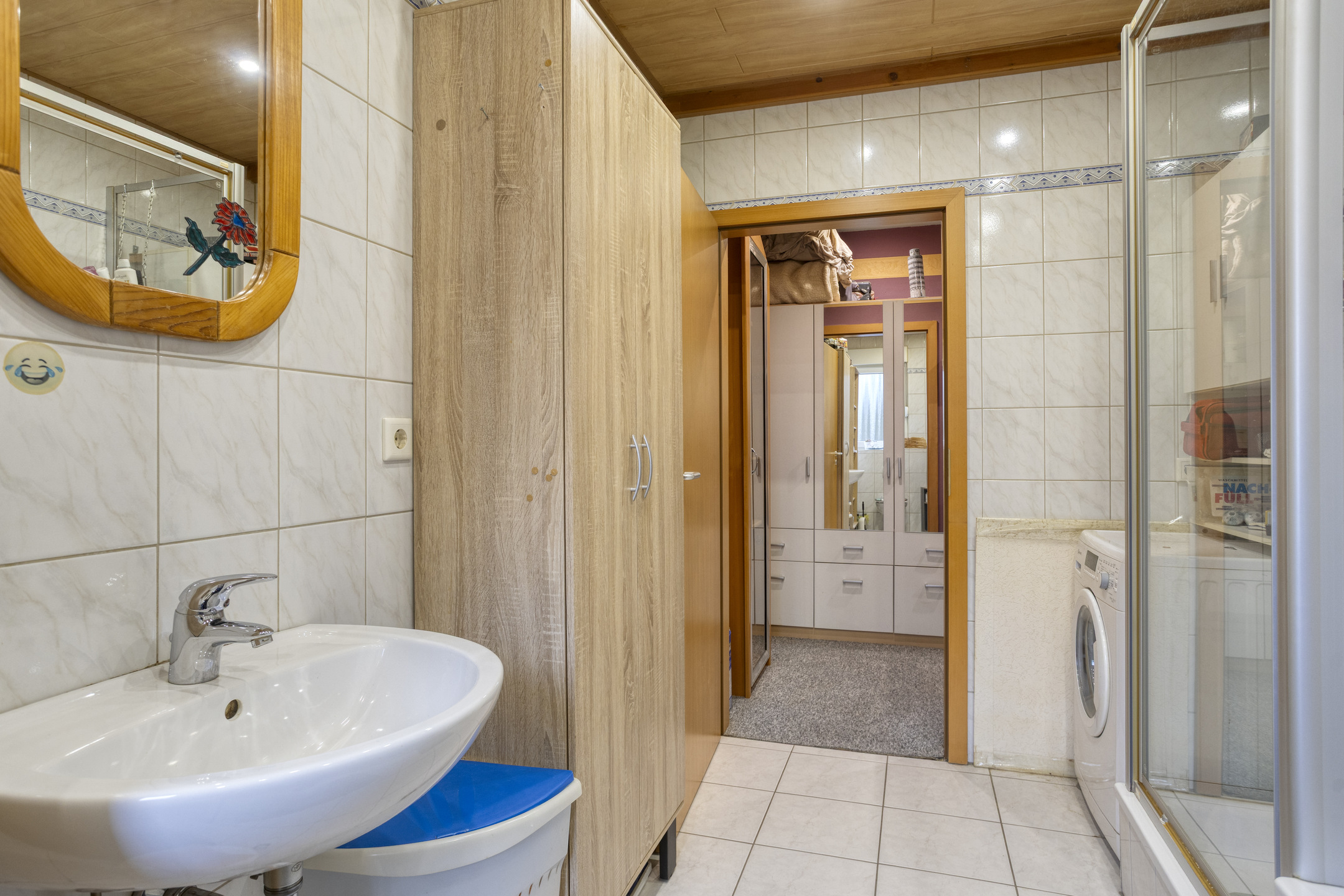 Das Badezimmer stammt aus dem Baujahr 2001 und ist funktional ausgestattet mit Badewanne, Dusche sowie einem Waschmaschinenanschluss.